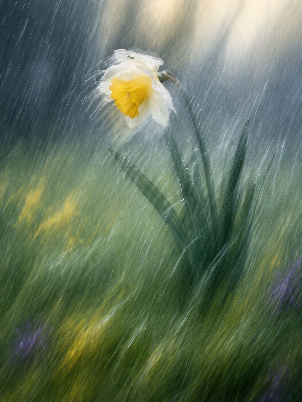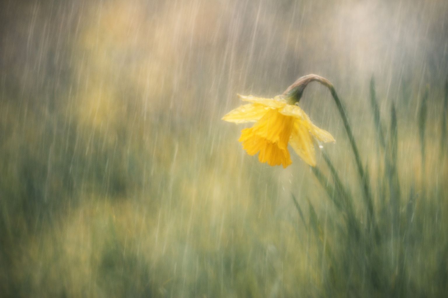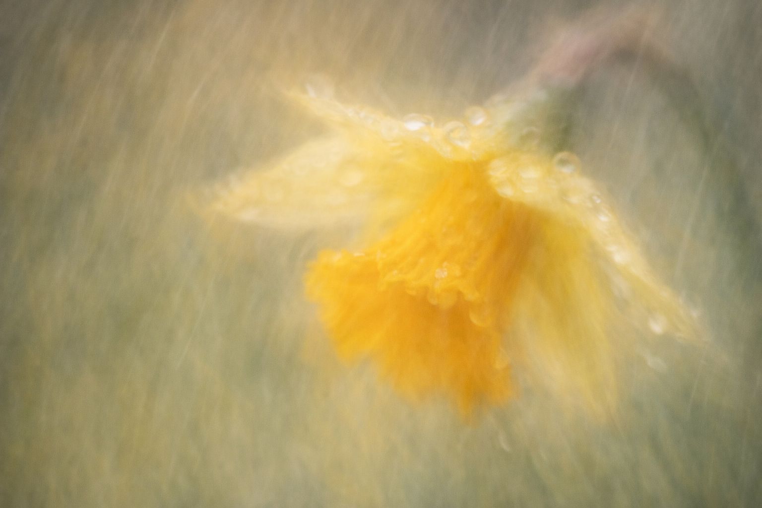 Genau so ein Moment entsteht, wenn man eine einfache Narzisse im leichten Regen fotografiert – und sich bewusst dafür entscheidet, die Kamera zu bewegen.