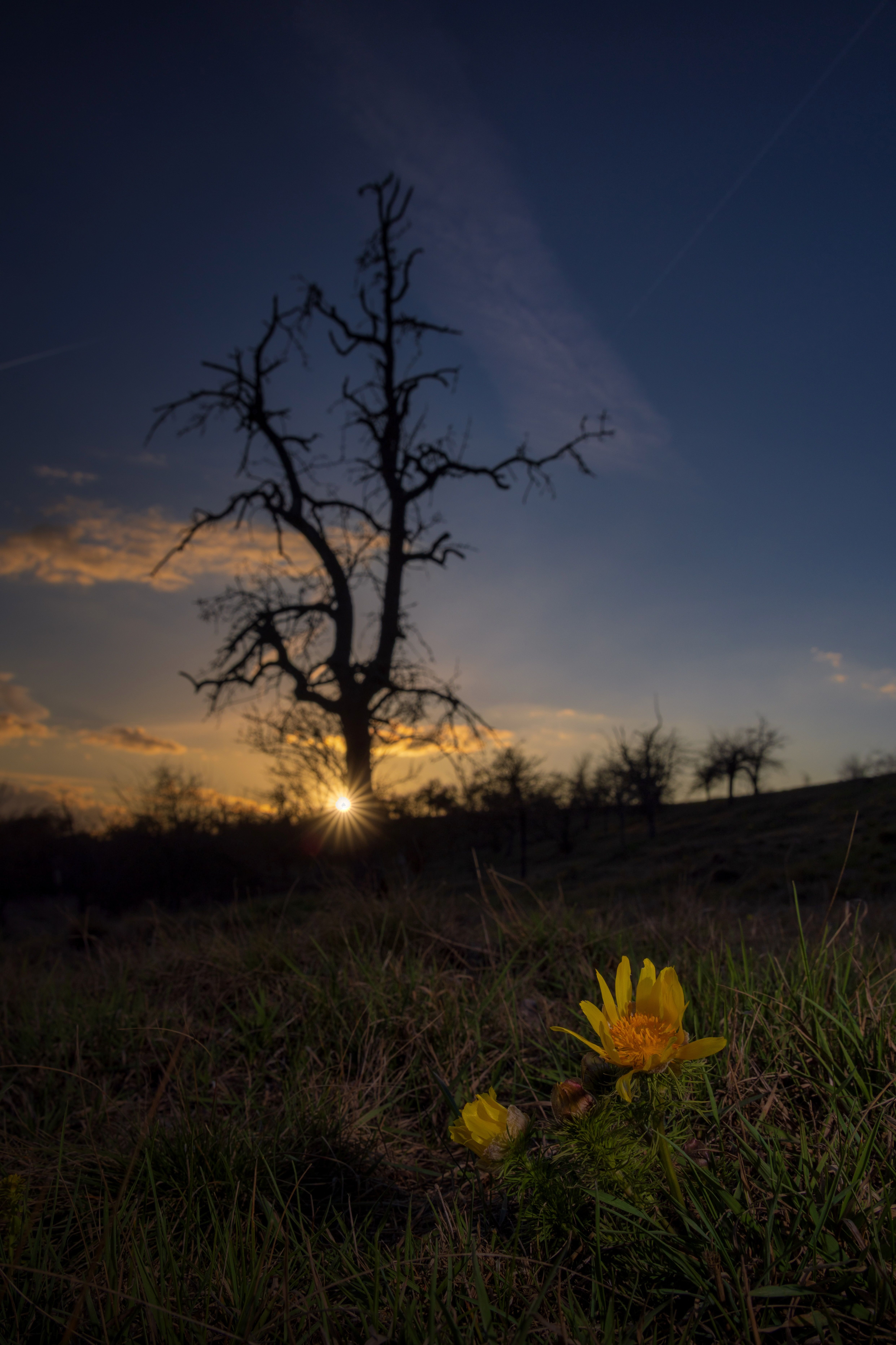 Ein Motiv hat mich dabei besonders gefesselt: die Adonisröschen vor der untergehenden Sonne, flankiert von den dunklen Silhouetten alter Bäume. Diese Kontraste aus Licht und Schatten, aus zarter Blüte und rauer Landschaft, machen für mich den Reiz solcher Abende aus. Die Blumen wirken dadurch nicht bloß dekorativ, sondern eingebettet in einen größeren Zusammenhang. Sie gehören zu diesem Ort, zu diesem Hang, zu dieser Jahreszeit.
