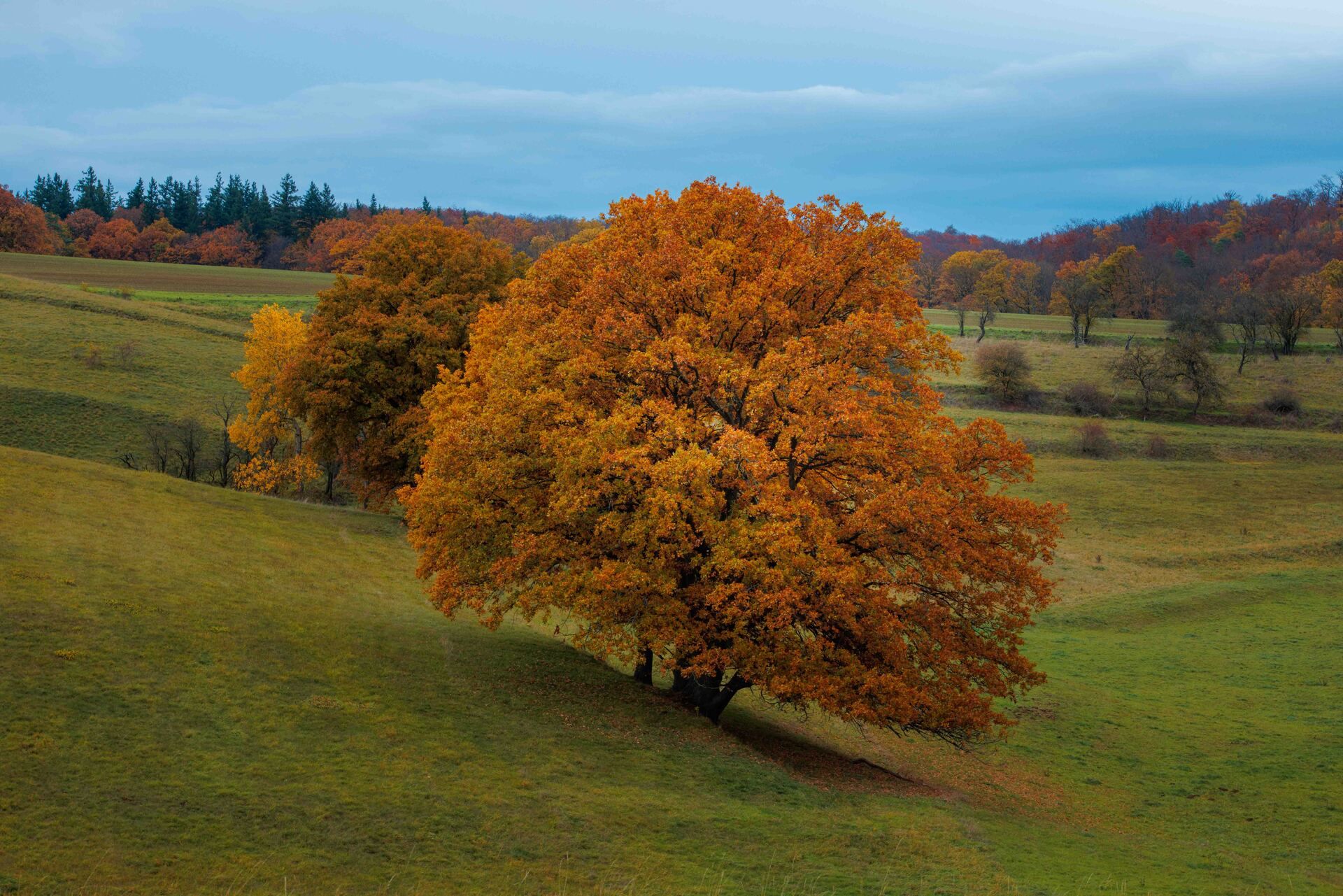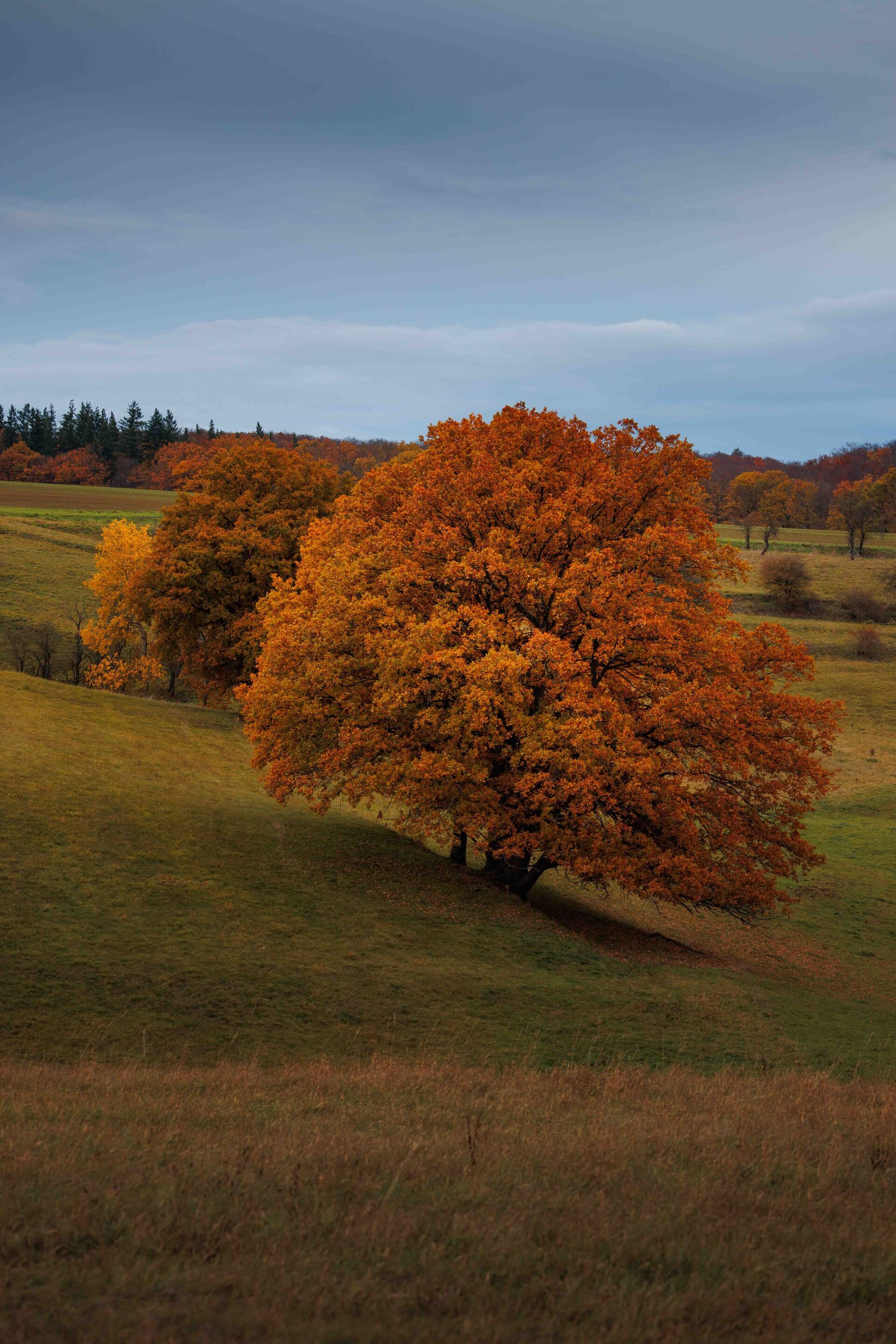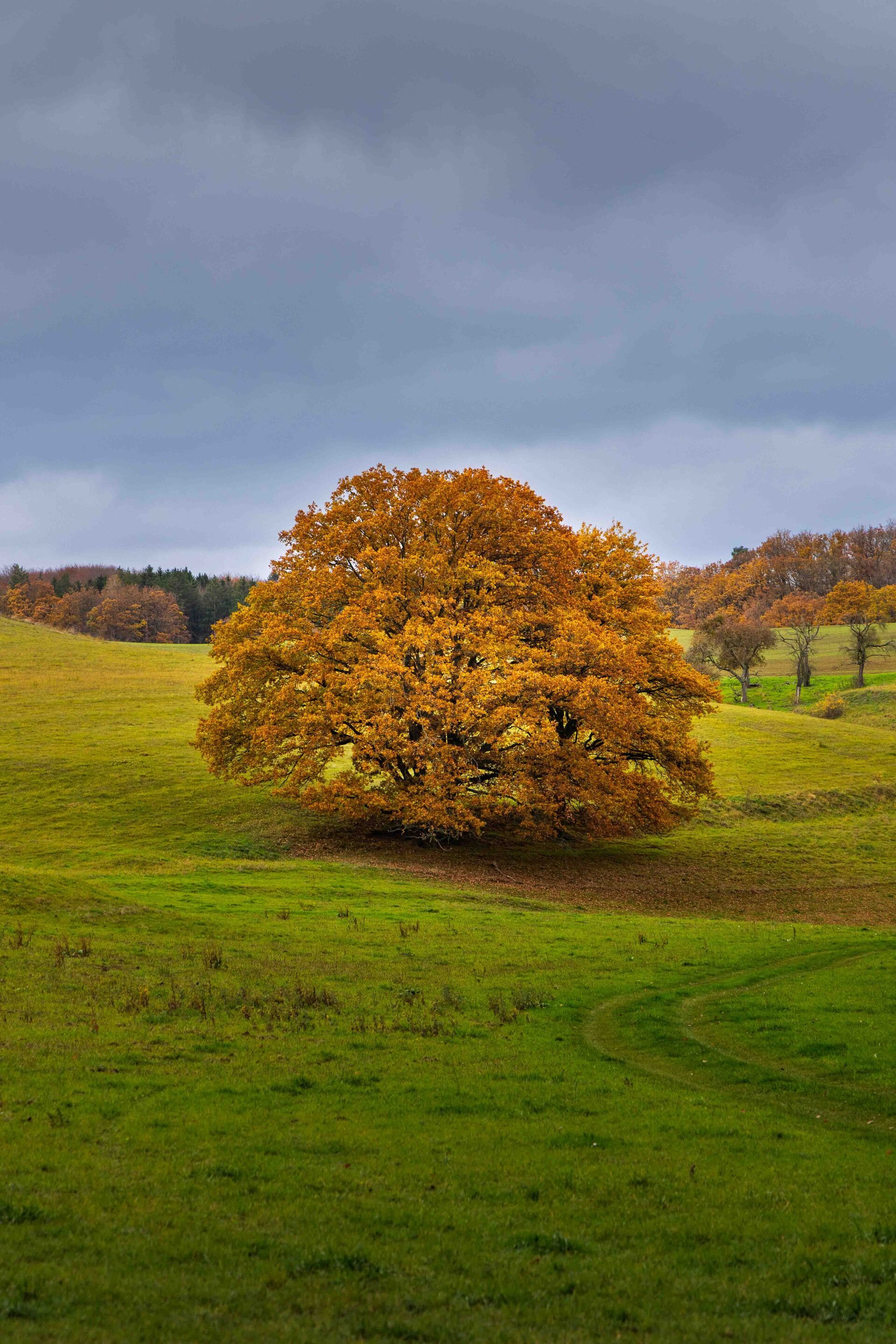 Solitärbäume üben eine ganz besondere Faszination aus. Alleinstehend in der Landschaft erzählen sie Geschichten von Zeit, Witterung und Wandel – besonders im Herbst, wenn sich ihr Blätterkleid in leuchtenden Farben präsentiert. Die kräftigen Orangetöne, das gedämpfte Licht und die ruhige Stimmung schaffen ideale Voraussetzungen für stimmungsvolle Aufnahmen.
